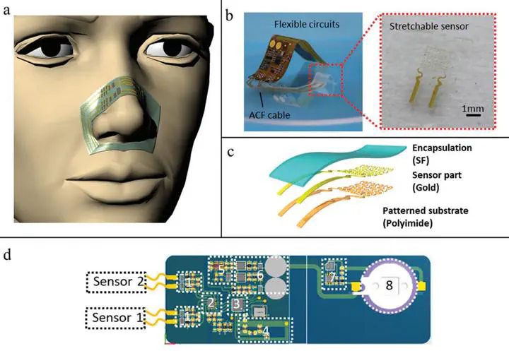 To perform wearable and continuous health monitoring, epidermal electronics for all kinds of sensing have been developed, yet neither organic nor inorganic materials-based epidermal devices are able to perform the functions like signal collection, processing, transmission, or power supply. Here, a strategy is reported to build skin-like hybrid integrated circuits (SHICs) with stretchable sensors and commercial chips for long-term respiratory monitoring. It can independently perform signal acquisition, processing, converting, and wireless transmission with carrying power supply. Thermal theory model is established to characterize the breathing air’s interaction with the sensor, which helps in signal analysis. Respiratory monitoring on human body is tested in diverse daily activities including exercising, dining, drinking, and sleeping with a custom-developed phone application to record and display the respiratory signal. Results show that the SHIC is of high efficiency and accuracy to track the breath patterns continuously in both static and moving scenarios. Furthermore, the SHIC is a feasible and promising platform that can be extended with multiple sensors or actuators in individualized medical applications and physiological study.