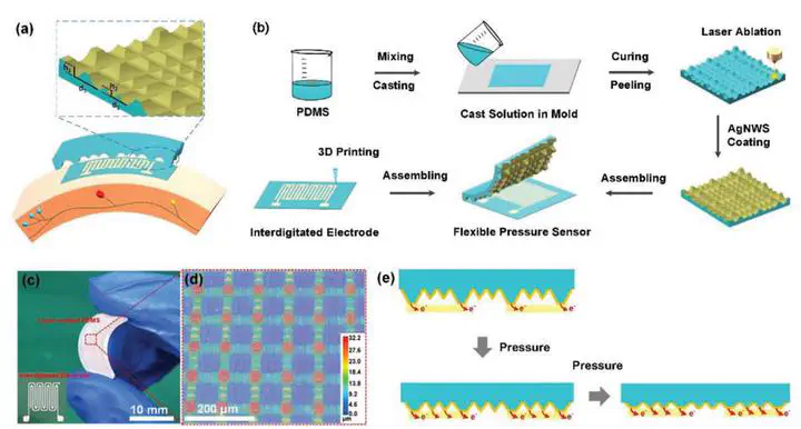 Flexible pressure sensors are attracting considerable attention due to their potential applications in human health monitoring and human-machine interfaces. However, it is hard to achieve both high sensitivity and wide linear detection range, and the complicated fabrication process restricts their practical applications. Herein, a simple and scalable fabrication process for a flexible pressure sensor with high sensitivity and wide detection range has been developed by combining the silver nanowires coated, laser-ablated hierarchical microstructured polydimethylsiloxane, and an interdigital electrode. The hierarchical microstructures contribute to the high sensitivity of 4.48 kPa−1 and increase detection range from 0 to 65 kPa. The increase in the contact area and subsequent additional contact sites of the hierarchical microstructures lead to the high-performance. Arterial pulse, breathing, and static tremors have been measured by attaching the device to the human body. Moreover, a pressure sensor array has been fabricated to illustrate the scalability of this strategy. The results demonstrate that the flexible pressure sensor with simple and scalable fabrication capability has promising applications in wearable electronic skins.