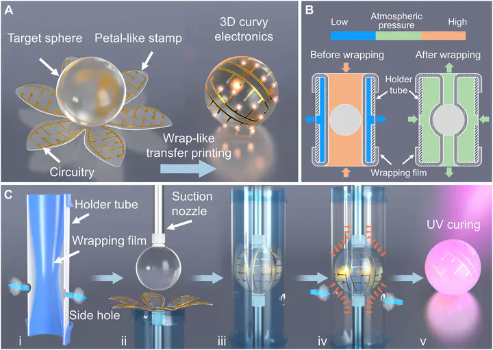 Three-dimensional (3D) curvy electronics has wide-ranging application in biomedical health care, soft machine, and high-density curved imager. Limited by material properties, complex procedures, and coverage ability of existing fabrication techniques, the development of high-performance 3D curvy electronics remains challenging. Here, we propose an automated wrap-like transfer printing prototype for fabricating 3D curvy electronics. Assisted by a gentle and uniform pressure field, the prefabricated planar circuits on the petal-like stamp are integrated onto the target surface intactly with full coverage. The driving pressure for the wrapping is provided by the strain recovery of a prestrained elastic film triggered by the air pressure control. The wrapping configuration and strain distribution of the stamp are simulated by finite element analysis, and the pattern and thickness of the stamps are optimized. Demonstration of this strategy including spherical meander antenna, spherical light-emitting diode array, and spherical solar cell array illustrates its feasibility in the development of complex 3D curvy electronics. A wrap-like transfer printing strategy is used to integrate electronics onto 3D curvy surfaces automatically with full coverage.